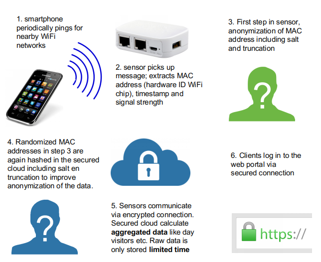 We don’t store real MAC addresses. Pseudomized MAC addresses are stored up to 90 days on our server. The reason is to be able to reprocess the data to derive visitor metrics with new settings such as a other signal threshold. Furthermore, we remove MAC addresses that are on the opt-out list from the privacySIG. Also we remove MAC addresses that are seen often or a long time (e.g. employees, local residents or nearby WiFi equipment). This is done via an automatic detection system. Removing those MAC addresses is performed by applying the same method of hashing and truncation to those addresses. Finally the sensor also has a privacy setting; only hashed MAC addresses are stored if the number of detected MAC addresses exceeds 2 in a period of 15 minutes (default setting).